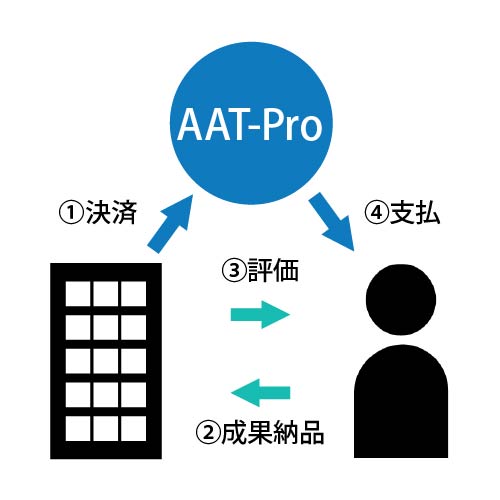 報酬の支払いには仕事の受注前に企業側から「AAT-Pro」が一度預かり、人材側の仕事の完了と企業側の評価双方が終わってから、応募社側に給与が支払われる機能「エスクロー決済」を導入しています。不払いや案件の放棄などの心配なく、依頼から支払いまで双方が安全でスムーズな取引をすることができます。