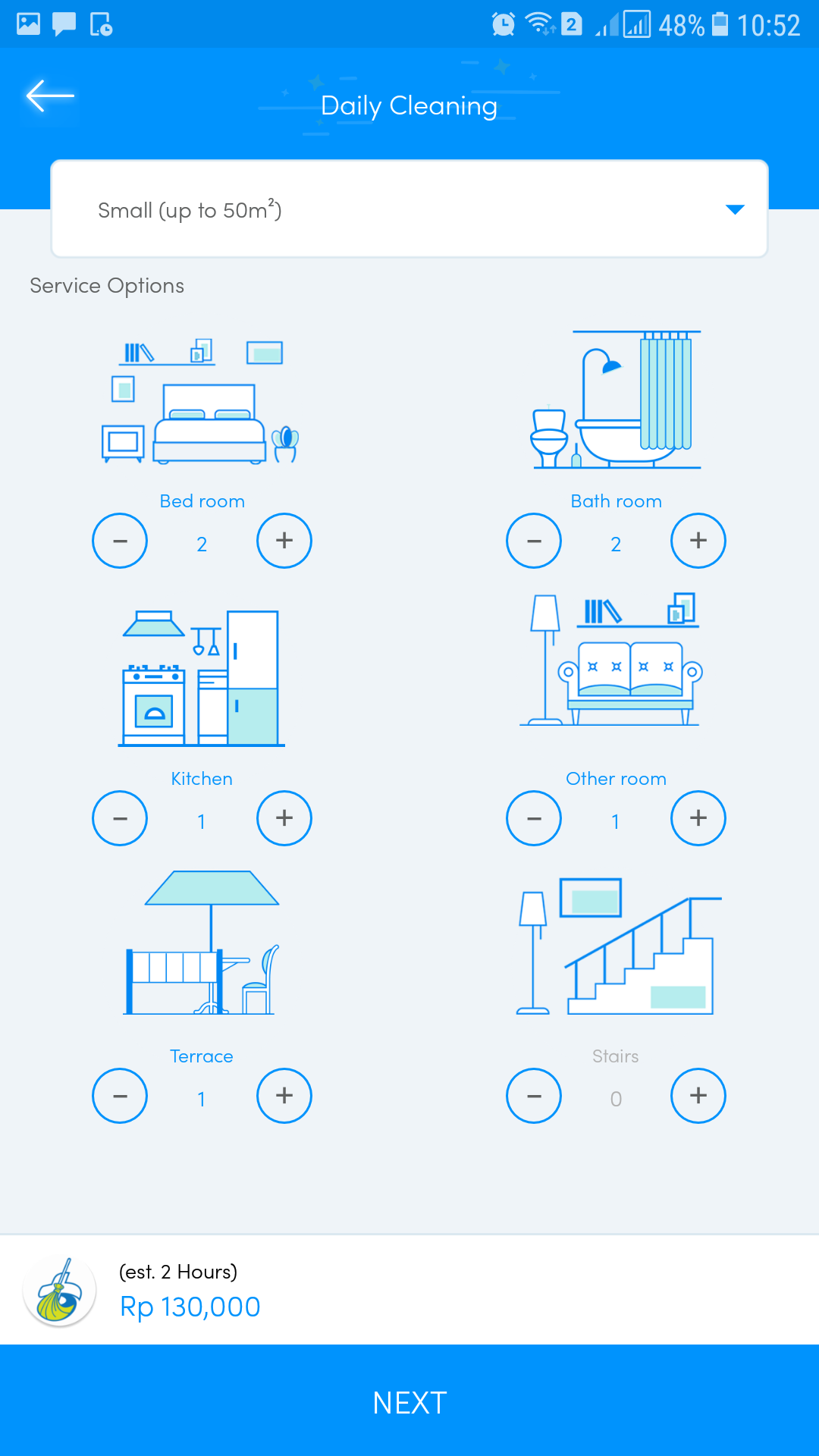 layanan yang dibutuhkan, pilih jumlah ruang yang akan dibersihkan. Ada beberapa pilihan