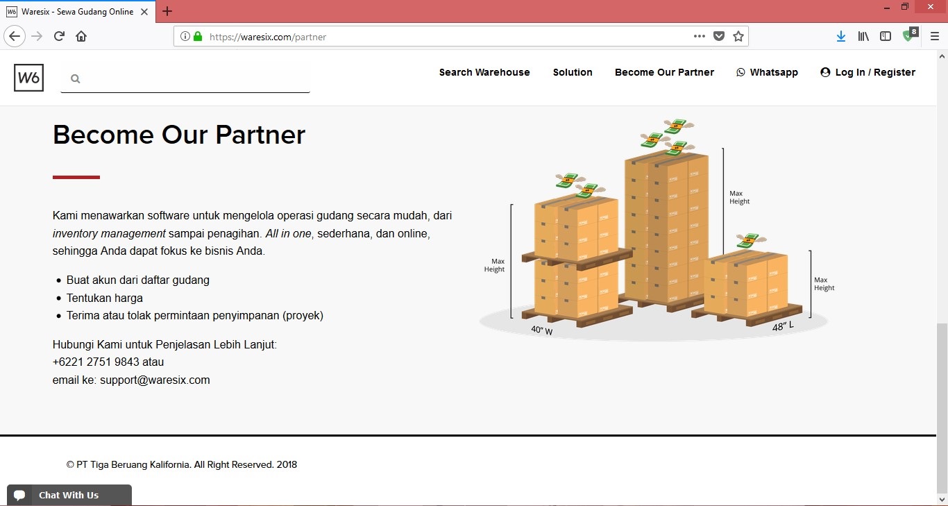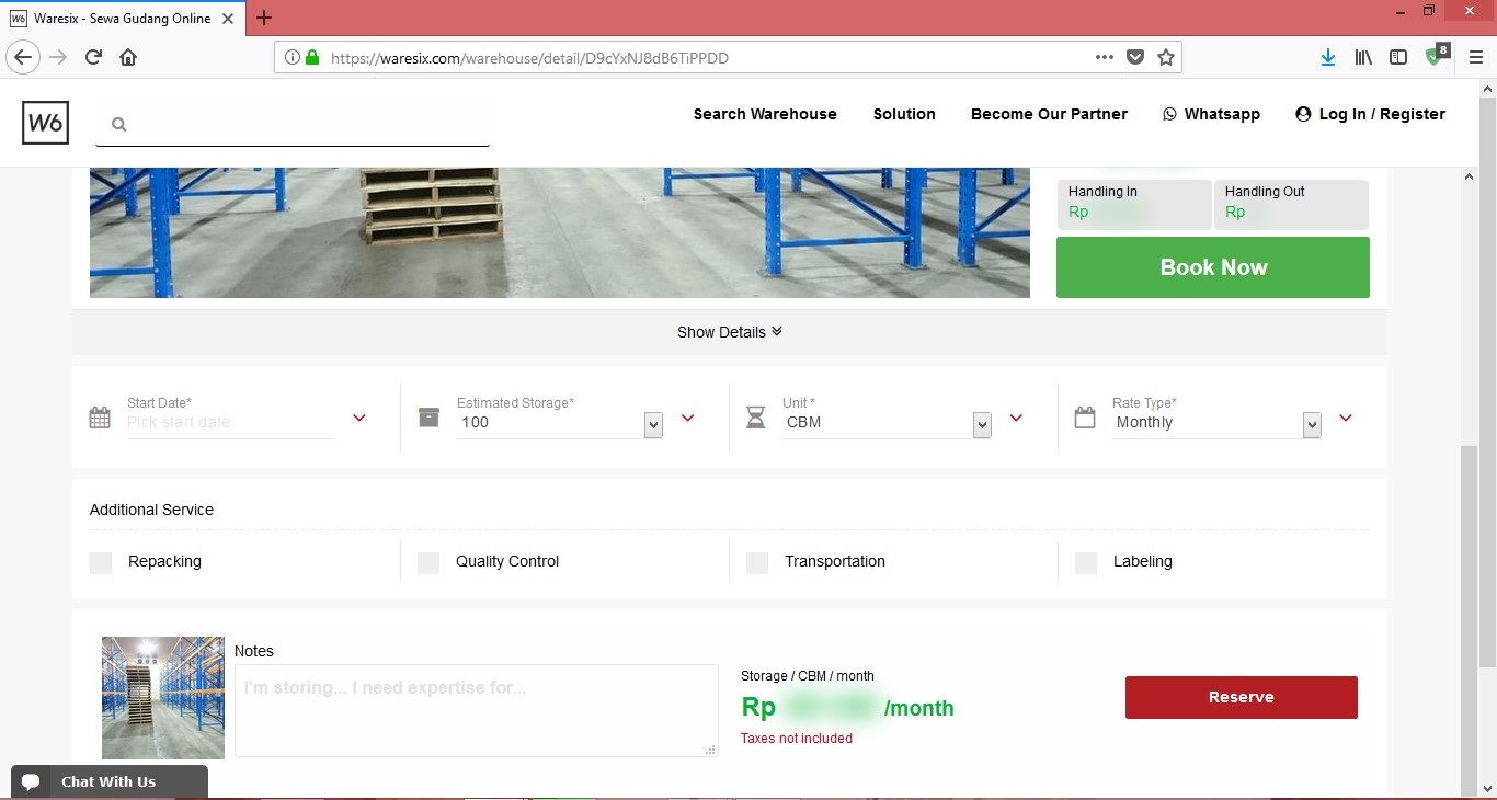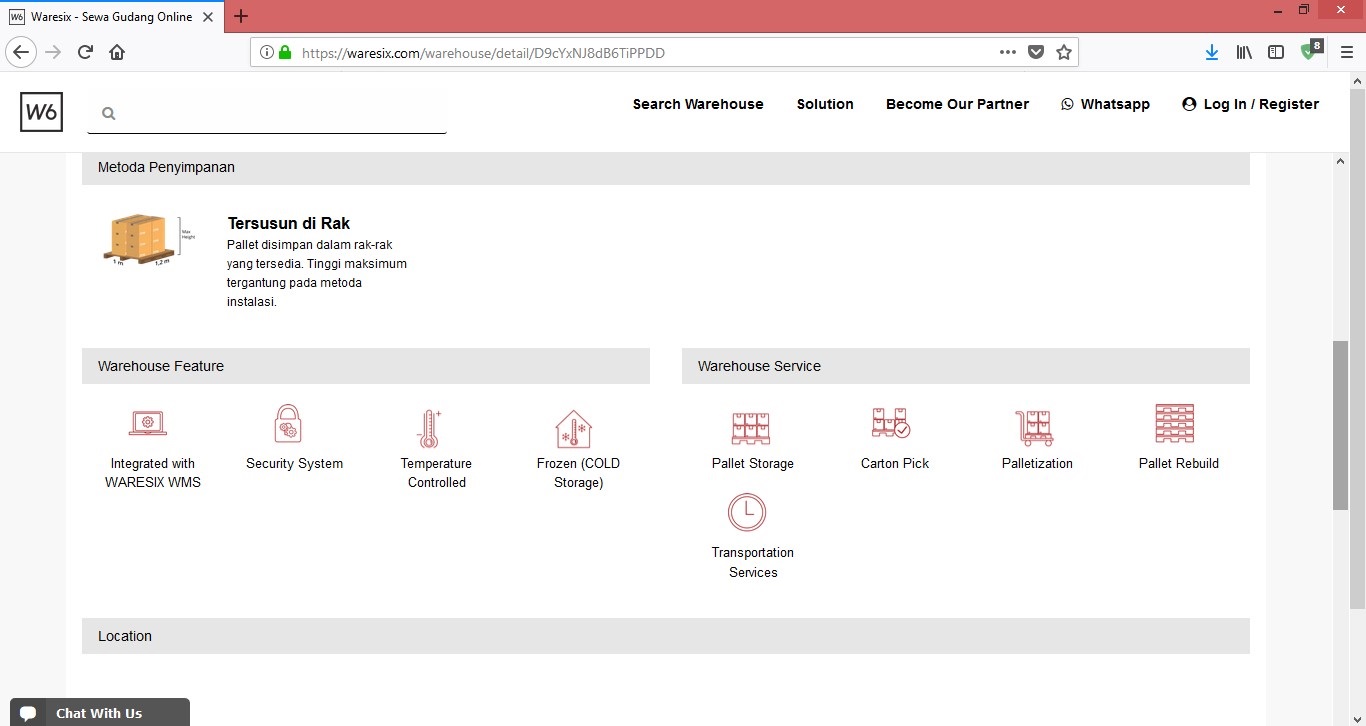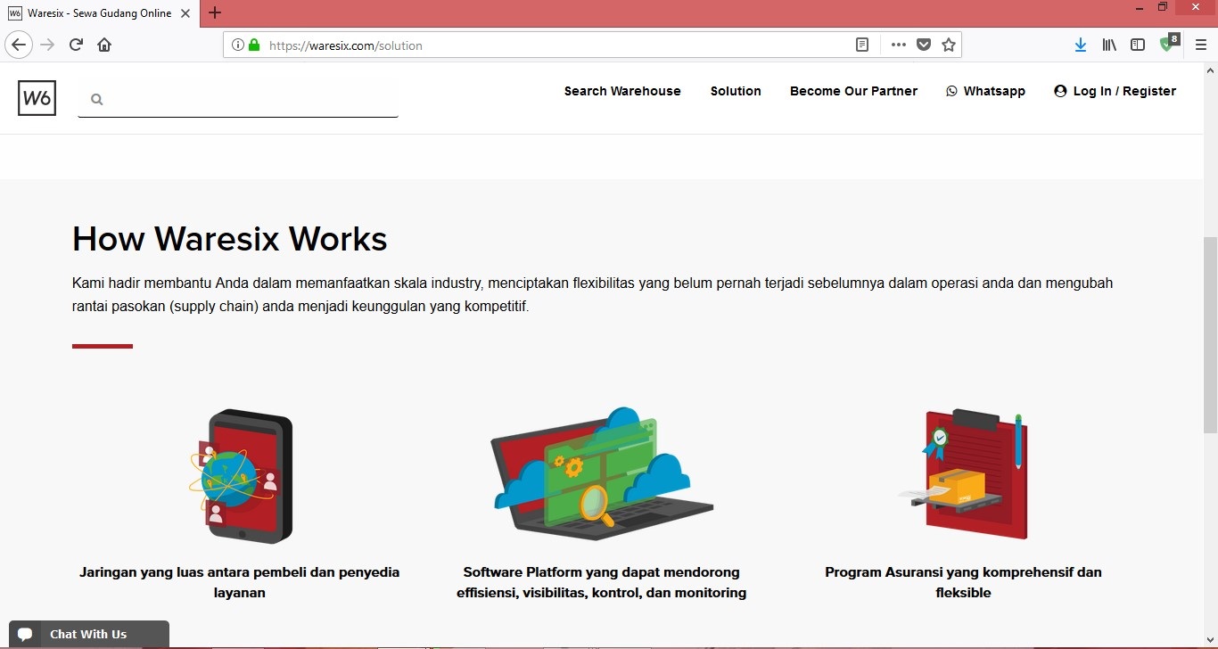 Bahasa Indonesia Temukan Gudang Sementara Anda di Waresix.com Dengan mengadopsi konsep seperti sewa kamar, rumah, dan apartemen yang dipopulerkan AirBnB, kali ini ada beberapa startup yang menawarkan jasa penyewaan gudang. Melihat sektor industri transportasi dan pergudangan dinilai masih prospektif, kini mulai bermunculan bisnis model Airbnb untuk warehouse yang sudah beroperasi di Indonesia. Salah satunya adalah Waresix.com. Waresix merupakan layanan jasa gudang on demand, yang memungkinkan Anda menemukan tempat penyimpanan barang dengan cepat dan mudah. Anda hanya perlu membayar sesuai dengan luas tempat yang digunakan. Layanan ini bisa menjadi solusi bagi pebisnis yang mengalami kelebihan stok barang, hingga pemilik barang yang membutuhkan tempat penyimpanan sementara. Dengan software yang disediakan Waresix, kamu bisa mengatur aktivitas penyimpanan dan pengiriman barang, serta pengelolaan kontrak dan tagihan secara online. Jika ingin menyewa gudang atau menjadi partner menyewakan gudang, Anda harus register terlebih dahulu. Saat ini Waresix hanya bisa di akses melalui website. Pada website, Anda bisa melihat list gudang yang disewakan beserta waktu penggunaan gudang tersebut. Setelah cocok dengan partner gudang yang sesuai kebutuhan Anda, klik Book Now. Kemudian, jadwalkan pengiriman barang setelah konfirmasi area penyimpanan. Barang Anda terjamin keamanannya. Tarif warehouse sharing ini adalah per bulan. Detail harga warehouse sharing hanya bisa dilihat ketika Anda sudah terdaftar di platform ini. Waresix menawarkan kualitas gudang yang terbaik. Prosedur operasi pengguna dan partner pemiliki gudang pun terjamin. Kelebihan lainnya adalah bisa diakses dari mana saja. Layanan Waresix kini dapat menjangkau berbagai kota besar di Indonesia, di antaranya Jakarta, Semarang, Yogyakarta, Surabaya, Medan, Lampung, Pekanbaru, Makassar, dan Balikpapan. Waresix menargetkan dapat membantu konsumen mengatasi berbagai permasalahan seperti persediaan overflow, distribusi produk, penyimpanan sementara, dan solusi cross-docking. English Find Your Temporary Warehouse in Waresix.com By adopting concepts such as sharing of rooms, houses and apartments popularized by AirBnB, this time there are several startups offering warehouse sharing services. Seeing that the transportation and warehousing industry sector is still prospective, now Airbnb businesses are emerging for warehouses that are already operating in Indonesia. One of them is Waresix.com. Waresix is ??a warehouse on demand service, which allows you to find goods storage quickly and easily. You only need to pay according to the area used. This service can be a solution for business people who experience excess inventory, to owners of goods that need temporary storage. With software provided by Waresix, you can manage storage and shipping activities of goods, as well as managing contracts and bills online. If you want to rent a warehouse or become a partner to share a warehouse, you must register first. Currently Waresix can only be accessed through the website. On the website, you can see the list of warehouses that are rented along with the time to use the warehouse. After matching the warehouse partner that suits your needs, then click Book Now. Make a schedule for shipment of your goods after confirming the storage area. Your security is guaranteed. This warehouse sharing tariff is paid per month. Details of the price of warehouse sharing can only be seen when you have registered on this platform. Waresix offers the best quality warehouses. The operating procedure of the user and warehouse owner is guaranteed. Another advantage is that Waresix can be accessed from anywhere. Waresix services currently reach various major cities in Indonesia, including Jakarta, Semarang, Yogyakarta, Surabaya, Medan, Lampung, Pekanbaru, Makassar and Balikpapan. Waresix targets to help consumers overcome various problems such as overflow inventory, product distribution, temporary storage, and cross-docking solutions.