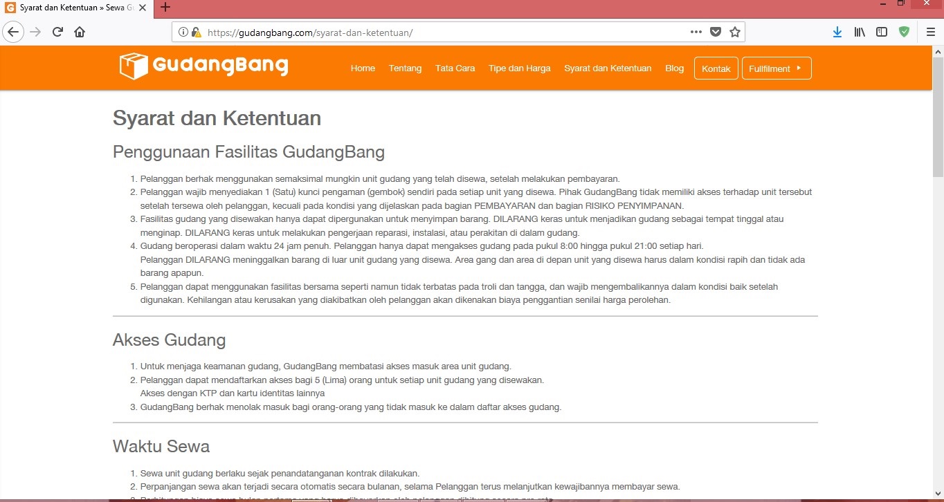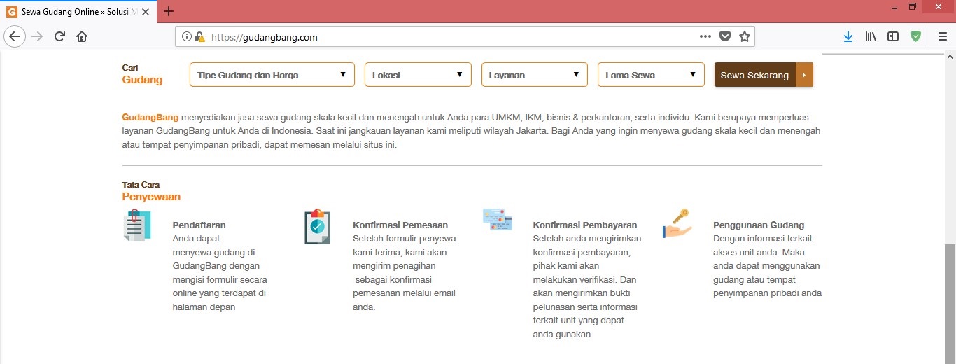 Bahasa Indonesia Solusi Gudang Dengan Biaya Hemat Jasa berbagi gudang tempat penyimpanan mulai berkembang di Indonesia. Meskipun masih belum banyak jumlah layanan seperti ini, namun beberapa yang sudah berjalan terbukti sangat membantu para pengusaha di Indonesia. Salah satunya adalah layanan berbagi gudang yang disebut Gudangbang.com. Gudangbang berfokus untuk mengatasi kesulitan yang dialami oleh usaha mikro, kecil dan menengah dalam menemukan gudang penyimpanan barang. Kesulitan tersebut diantaranya adalah sewa gudang jangka pendek, luasan kecil, hingga biaya yang tidak sesuai kemampuan kantong. Gudangbang merupakan platform yang mampu menjawab kebutuhan dan memberikan solusi terhadap masalah yang dialami para pemilik gudang sekaligus pengusaha dan masyarakat yang membutuhkan gudang. Sama seperti Waresix, Gudangbang.com saat ini hanya bisa diakses melalui website. Tata cara menggunakan layanan ini jelas dideskripsikan pada website. Pertama, kita harus melakukan pendaftaran dengan mengisi formulir secara online. Ketika mengisi formulir, Anda diminta mengisi tipe gudang, lokasi dan lama peminjaman. Setelah konfirmasi pemesanan gudang, Anda perlu melakukan pembayaran. Kemudian konfirmasi pembayaran dan Anda bisa menggunakan gudang tersebut. Ada dua tipe ukuran gudang, yaitu gudang kecil dengan ukuran 1.2m x 3m x 2.4m seharga Rp.650.000/bulan. Dan tipe gudang menengah, dengan ukuran 1.2m x 5m x 2.4m seharga Rp. 1.000.000/bulan. Harga yang ditawarkan oleh Gudangbang relatif murah. Ada layanan tambahan yang ditawarkan yaitu layanan antar jemput barang dari lokasi anda ke lokasi gudang. Tentunya akan ada biaya tambahan untuk layanan ini. Hal yang menarik adalah per satu gudang disewa dapat digunakan bersama hingga lima orang. Sedangkan fasilitas pelengkap untuk memberikan rasa aman dan nyaman bagi para penyewa antara lain CCTV dan WiFi. Bagi Anda yang ingin berbagi gudang kosong yang ada, bisa langsung melakukan pendaftaran di website Gudangbang.com. English Low Cost Warehouse Solution Warehouse sharing services began to develop in Indonesia. Although there are still not many services like this, some of which have already exist been proven to be very helpful for entrepreneurs in Indonesia. One of them is a warehouse sharing service called Gudangbang.com. Gudangbang focuses on overcoming the difficulties experienced by micro, small and medium enterprises in finding goods storage warehouses. These difficulties include short-term warehouse rent, small area, and costs that do not match with the budget. Gudangbang is a platform that is able to answer needs and provide solutions to problems experienced by warehouse owners as well as entrepreneurs and people who need warehouses. Just like Waresix, Gudangbang.com is currently only accessible through the website. The procedure for using this service is clearly described on the website. First, we must register by filling out the form. When filling out the form, you are asked to fill in the warehouse type, location and duration of the loan. After confirming the warehouse booking, you need to make a payment. Then confirm the payment and you can use the warehouse. There are two types of warehouse sizes, first is small warehouses with a size of 1.2m x 3m x 2.4m for Rp.650,000 / month. And medium warehouse type, with a size of 1.2m x 5m x 2.4m for Rp. 1,000,000 / month. The price offered by Gudangbang is relatively cheap. There are additional services offered, it is pick up service from your location to the warehouse location. Surely there will be additional fees for this service. The interesting thing of Gudangbang is that one warehouse can be used with up to five people. While complementary facilities to provide a sense of security and comfort for tenants include CCTV and WiFi. For those of you who want to share an existing empty warehouse, you can directly register at Gudangbang.com website.