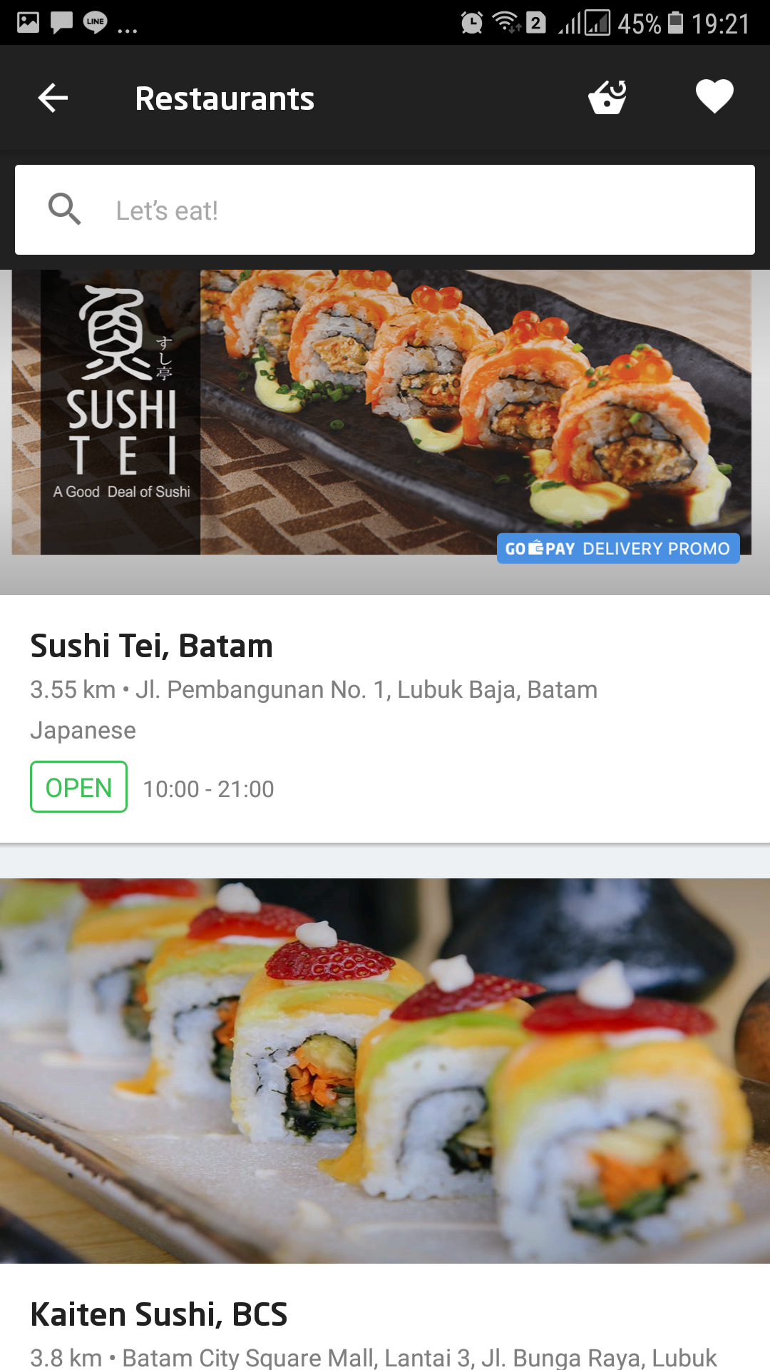 Go-Foodサービスの食品メニューは多様で寿司などの日本食もリストに入っています。