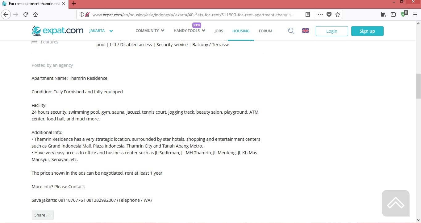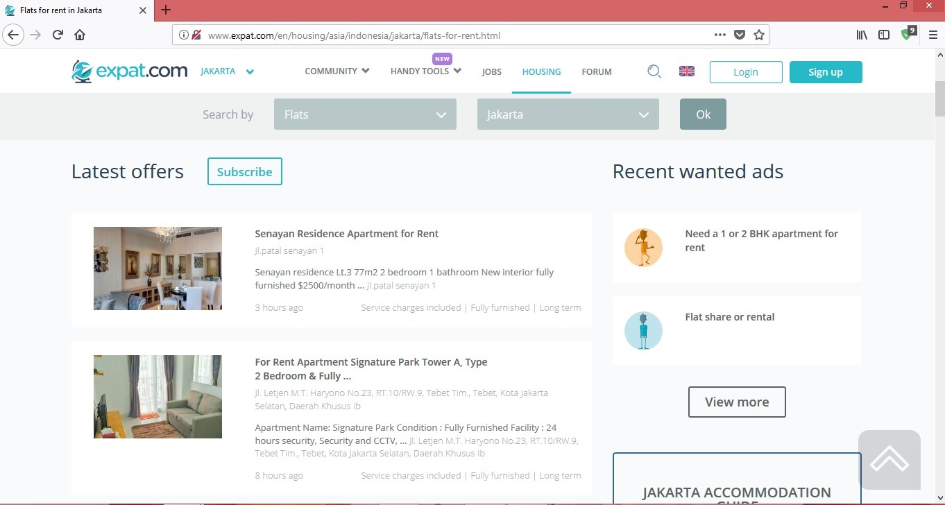 Bahasa Indonesia Temukan House-sharing untuk Expat di Indonesia Para pekerja asing di Indonesia disebut expat atau expatriate. Biasanya pekerja asing ini bekerja di kedutaan atau cabang perusahaan asing yang ada di Indonesia. Karena tinggal di negara asing, banyak aspek yang menjadi pertimbangan ketika seorang expat akan memulai kehidupan baru di negara baru. Salah satunya adalah tempat tinggal. Ya, rumah. Tidak sedikit expat di Indonesia yang lebih memilih house sharing daripada membeli sebuah rumah selama mereka bekerja dan tinggal disini. Salah satu website yang menjadi life guide para expat di Indonesia adalah expat.com. Website ini berisi konten yang sangat membantu bagi orang asing yang akan tinggal di Indonesia. Banyak informasi yang disediakan di expat.com, seperti house sharing di Indonesia, tips ketika pindah ke Indonesia, asuransi kesehatan untuk expat di Indonesia dan banyak artikel mengenai expat experiences di Indonesia. Melalui expat.com, kita akan mudah menemukan house sharing sesuai lokasi dimana Anda bekerja. Terutama di kota-kota besar seperti Jakarta, Surabaya, Bali dan Medan. Untuk mencari informasi house sharing, Anda perlu memilih lokasi terlebih dahulu. Kemudian pilih tipe tempat tinggal yang Anda inginkan. Ada pilihan rumah, apartemen, guesthouse, atau yang sesuai dengan kebutuhan Anda. Setelah itu, akan muncul beberapa referensi yang sesuai dengan keinginan Anda. Keterangannya sangat rinci, mulai dari lokasi, harga, fasilitas dan foto. Nomor kontak yang bisa dihubungi juga tertera jelas pada keterangan. Jadi, Anda bisa langsung menghubungi orang yang bersangkutan. Selain house share dan flat share, Anda juga bisa menemukan tempat tinggal yang disewakan (house rent). Jadi, ada banyak pilihan tipe tempat tinggal di website expat.com. Dengan adanya fitur Forum dan Blogs, Anda juga bisa mendapatkan informasi yang lebih rinci tentang kehidupan di Indonesia. Jadi, Anda bisa mempersiapkan diri dengan matang sebelum datang ke Indonesia. English Find a House-sharing For Expat in Indonesia Foreign workers in Indonesia are called expatriates. Usually these expats work in embassies or branches of foreign companies in Indonesia. Because they are living in a foreign country, many aspects are taken into consideration when an expat will start a new life. One of them is a place to stay. Yes, home. Not a few expats in Indonesia who prefer house sharing rather than buying a house during their work and live here. One of the website that become a life guide of expat in Indonesia is expat.com. This website contains of content that is very helpful for foreigners who will live in Indonesia. A lot of information is provided on expat.com, such as house sharing in Indonesia, tips when moving to Indonesia, health insurance for expat in Indonesia and many articles about expat experiences in Indonesia. Through expat.com, you will easily find house sharing according to the location where you work. Especially in big cities like Jakarta, Surabaya, Bali and Medan. To search for a house sharing information, you need to select a location first. Then select the type of residence you want. There is a choice of house, apartment, guesthouse, or that suits your needs. After that, some references will appear to your preferences. The details are very clear, ranging from location, price, facilities and photos. The contact numbers is also shown clearly in the description. So, you can directly contact the person for further information. In addition to house share and flat share, you can also find a rented residence in expat.com. So, there are many choices of type of residence on the expat.com website. With the Forum and Blogs feature, you can also get more detailed information about life in Indonesia. So, you can prepare carefully before coming to Indonesia.