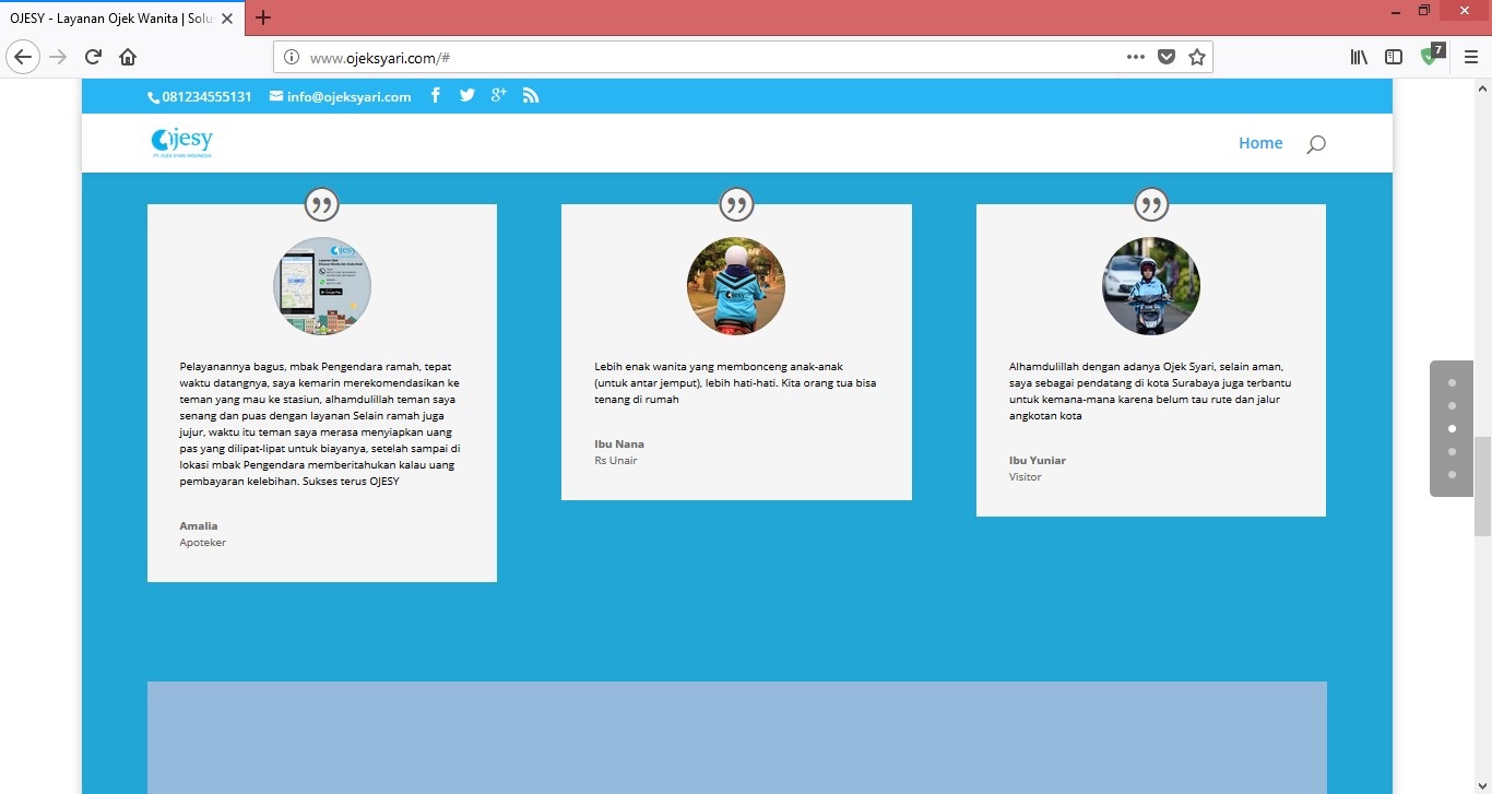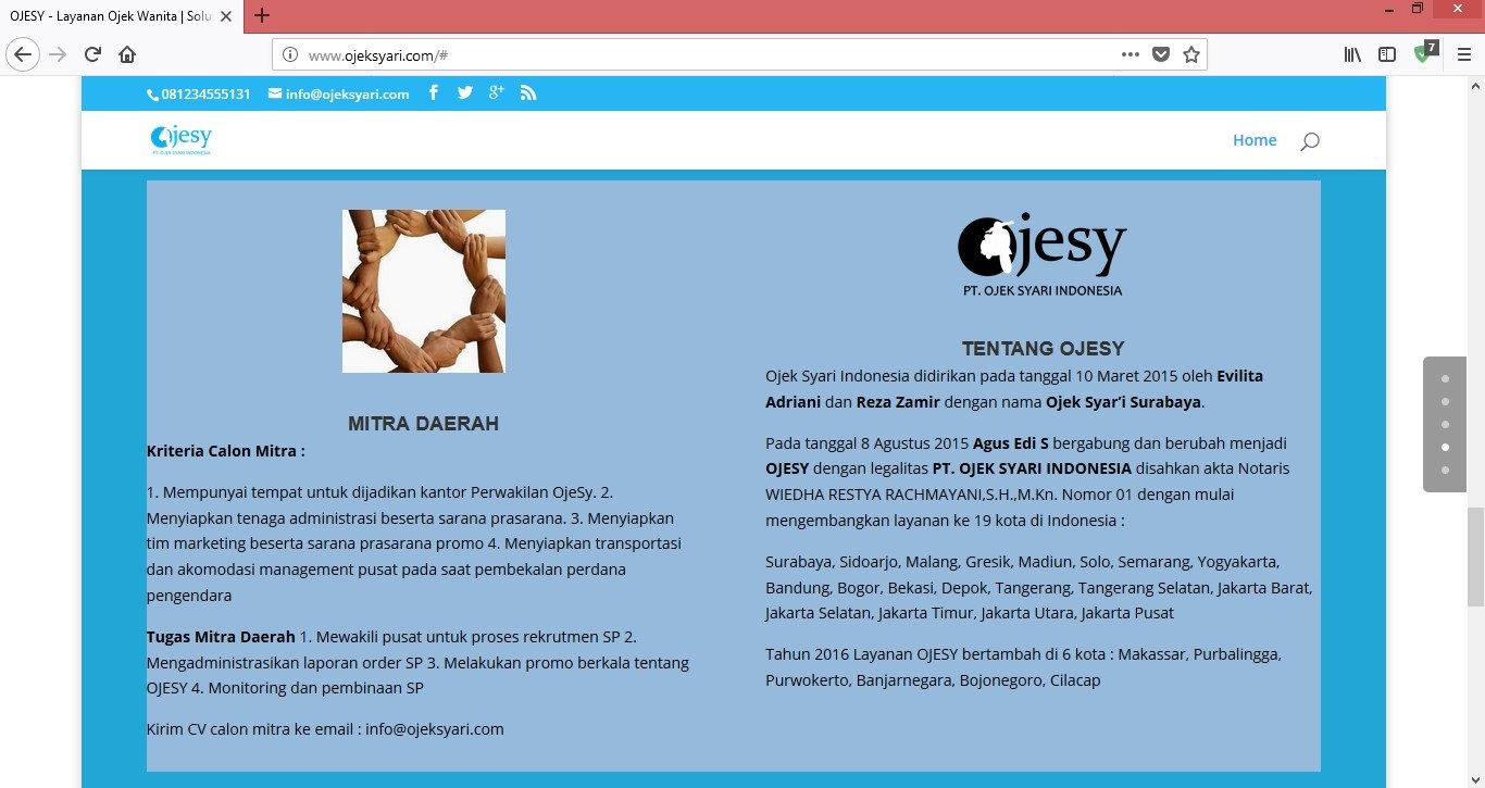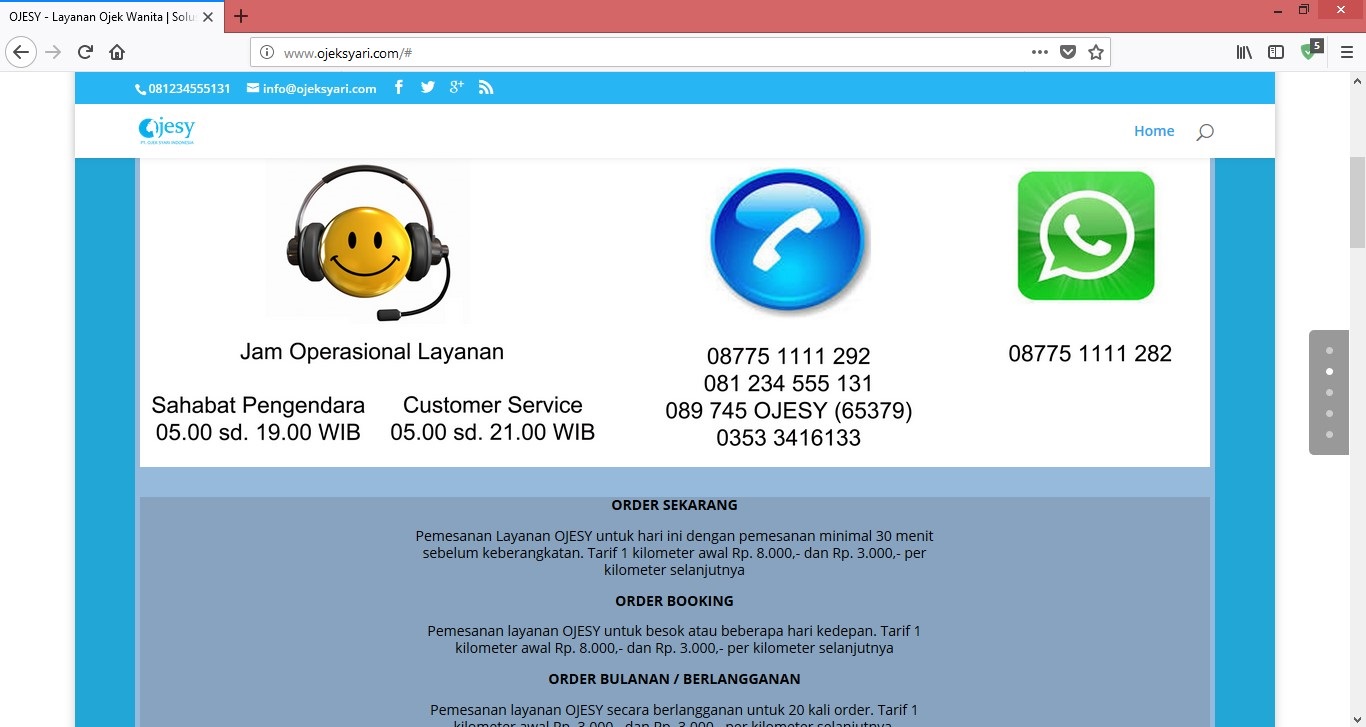 Bahasa Indonesia Ride-sharing Nyaman Bagi Kaum Hawa Ride-sharing sudah menjadi salah satu layanan penunjang transportasi. Industri transportasi online di Indonesia tidak hanya diisi oleh Go-Jek, Grab, dan Uber. Masih ada beberapa perusahaan lain yang turut mengembangkan bisnisnya di industri ini, salah satunya Ojesy. Ojesy adalah singkatan dari Ojek Syar’i. Ada yang unik dari layanan ride-sharing Ojesy ini, semua driver-nya adalah perempuan muslimah berhijab. Ojesy menargetkan pasarnya untuk semua wanita dan anak-anak. Ojesy masih melayani pengguna laki-laki, dengan catatan usianya tidak boleh lebih dari delapan tahun. Ojesy mulai beroperasi sejak tahun 2015. Saat ini, Ojesy sudah memiliki mitra pengemudi sebanyak 600 pengemudi dan tersebar di 25 kota di Indonesia. Ojesy memiliki empat pilihan layanan, yaitu Order sekarang, Order booking, Order bulanan/Berlangganan dan Order kurir. Untuk layanan Order sekarang, pemesanan dilakukan minimal 30 menit sebelum keberangkatan. Layanan Order booking untuk pemesanan perjalanan yang akan dilakukan besok atau beberapa hari kedepannya. Tarif 1 kilometer awal adalah Rp. 8,000. Layanan Order bulanan/Berlangganan untuk 20 kali perjalanan dalam sebulan, dengan tarif lebih murah yaitu Rp. 3,000 untuk 1 kilometer awal. Layanan Order kurir adalah pemesanan untuk pengiriman barang. Tarifnya sama dengan layanan Order bulanan/Berlangganan. Ojesy menjadi solusi bagi para wanita yang merasa tidak nyaman jika dibonceng oleh pengemudi pria. Begitu pula sebaliknya, pengemudi wanita yang tidak nyaman dengan penumpang pria pun bisa bergabung dengan Ojesy. Inilah mengapa Ojesy mendapat sebutan sebagai ojek khusus wanita. Ojesy banyak diminati oleh ibu rumah tangga, karyawati dan mahasiswi yang ingin menambah penghasilan tambahan. Para driver wanita ini cenderung lebih tertib berkendara, sehingga kita merasa lebih aman. Hal ini merupakan salah satu kelebihan dari Ojesy. English A Comfortable Ride Sharing For Women Ride-sharing has become one of the transportation support services. The online transport industry in Indonesia is not only filled by Go-Jek, Grab, and Uber. There are still several other companies that helped develop its business in this industry, one of them is Ojesy. Ojesy is an abbreviation of Ojek Syar'i. There is a unique ride from Ojesy's ride-sharing service, all of its drivers are female Muslim women. Ojesy targets the market for all women and children. Ojesy still serves male users, with notes of age should not be more than eight years old. Ojesy began operating since 2015. Currently, Ojesy already has a driver partner as many as 600 drivers and spread across 25 cities in Indonesia. Ojesy has four service options, namely Order now, Order booking, Monthly Order / Membership and Order courier. For Order now service, reservations are made at least 30 minutes before the trip departs. Order booking for the trip that will be done tomorrow or the next few days. The initial 1 kilometer tariff is Rp. 8,000. Monthly Order service / Subscription for 20 trips in a month, at a cheaper rate of Rp. 3,000 for 1 kilometer. Courier delivery service is ordering for delivery of goods. The rate is the same as the monthly Order / Subscription service. Ojesy becomes a solution for women who feel uncomfortable when being chauffeured by male drivers. Similarly, for female drivers who being uncomfortable with male passengers can join Ojesy. This is why Ojesy got the title as a ride-sharing for women only. Ojesy much in demand by housewives, employee and female students who want to gain additional income. The women drivers tend to be more orderly driving, so we feel more secure. This is one of the advantages of Ojesy.