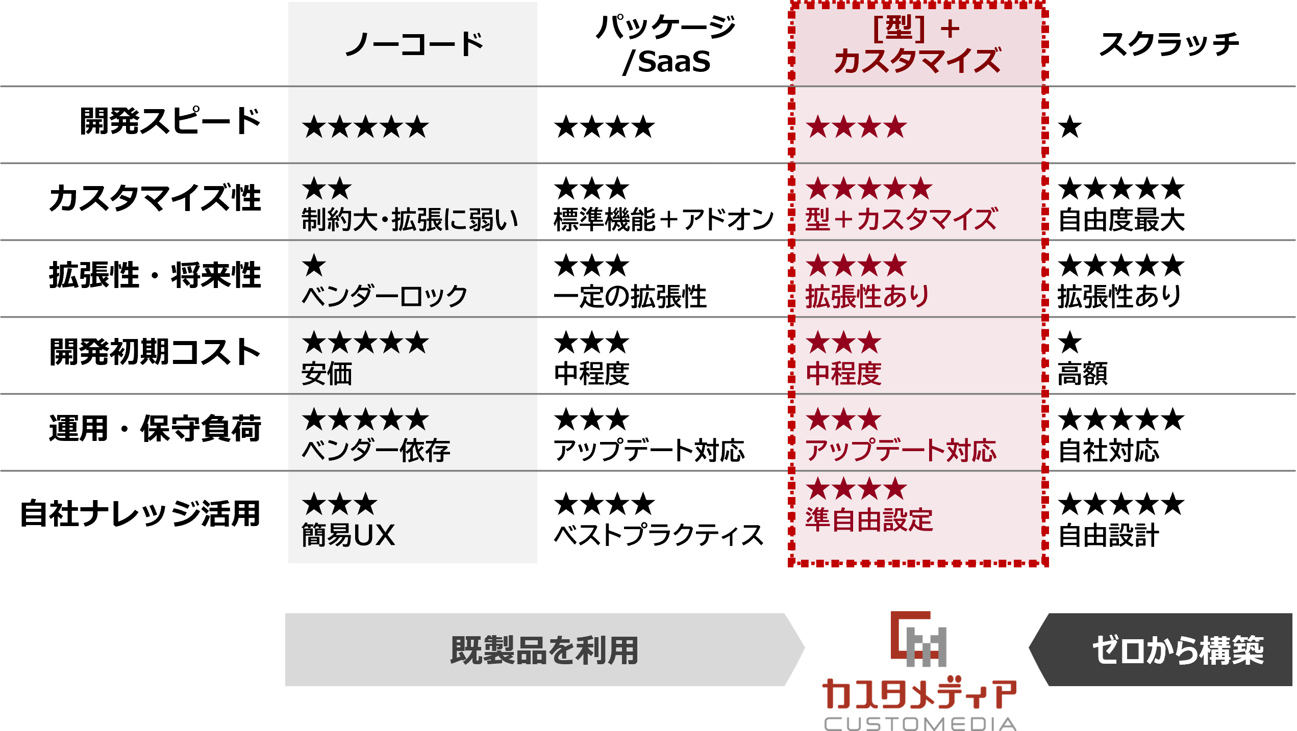 カスタメディアでは、800を超える実績から、プラットフォームの7つの「型」を持っています。この「型」を利用することで、低価格、短納期を実現しています。