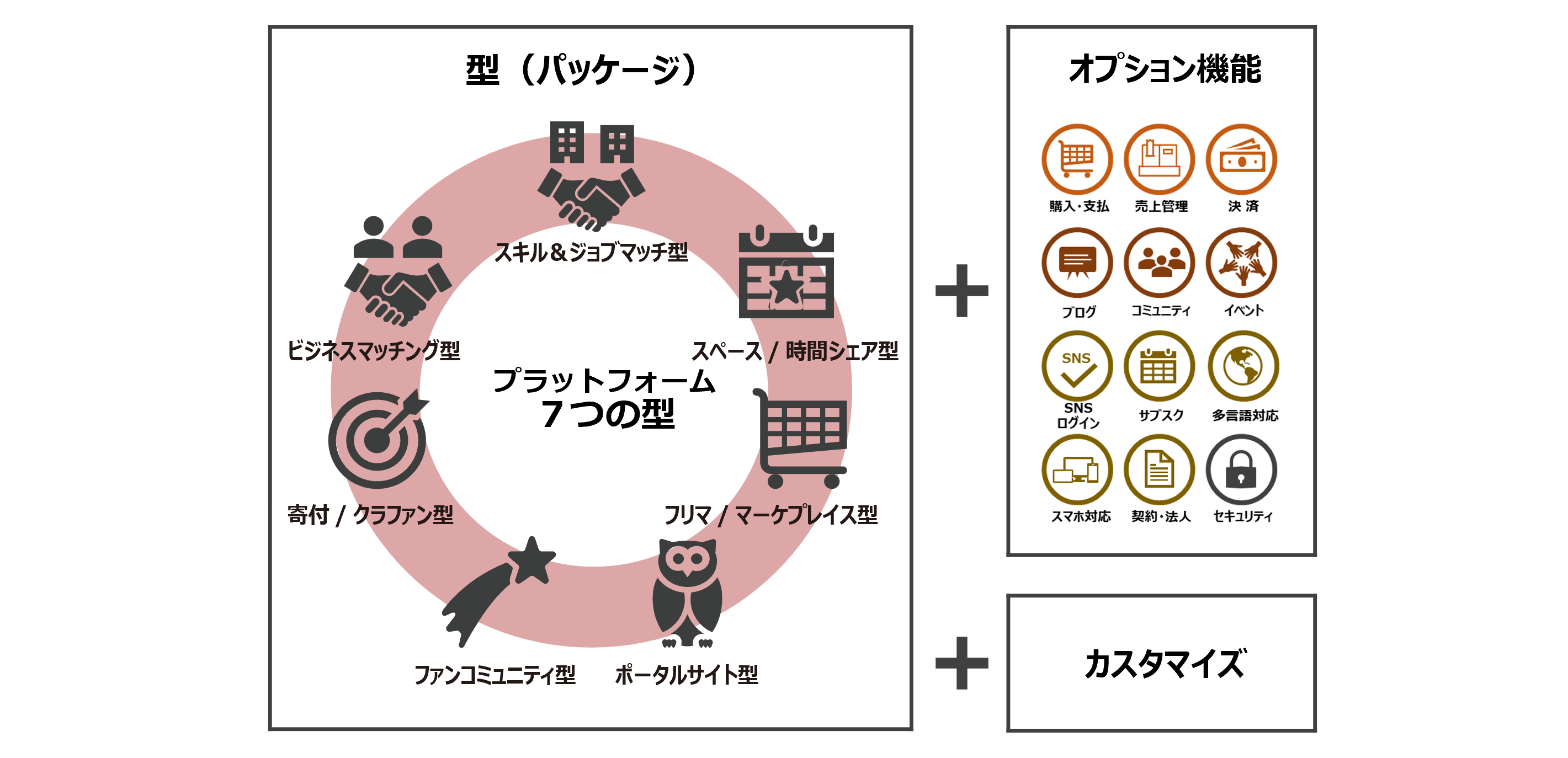 カスタマイズは可能です。貴社のビジネスモデルにプラットフォームを適合させるため、「型」をベースとして、そこにオプションを加えたり、さらにカスタマイズもお受けしています。