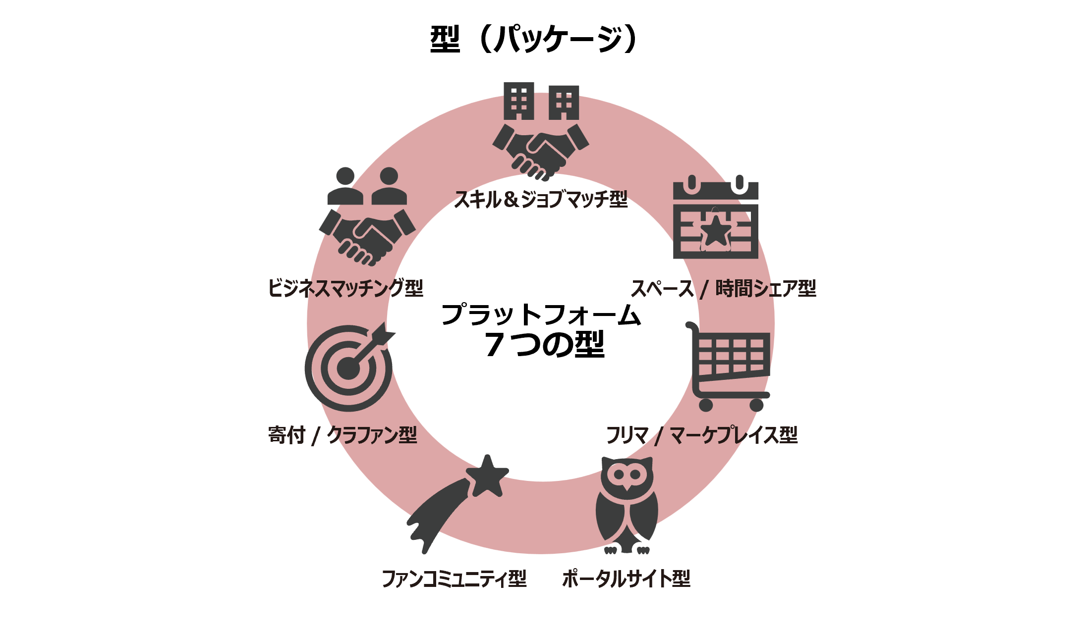 すべてのプラットフォームは、スキル&ジョブマッチ型、ビジネスマッチング型、フリマ/マーケプレイス型、スペース/時間シェア型、寄付/クラファン型、ファンコミュニティ型、ポータルサイト型のどれかに当てはまります。