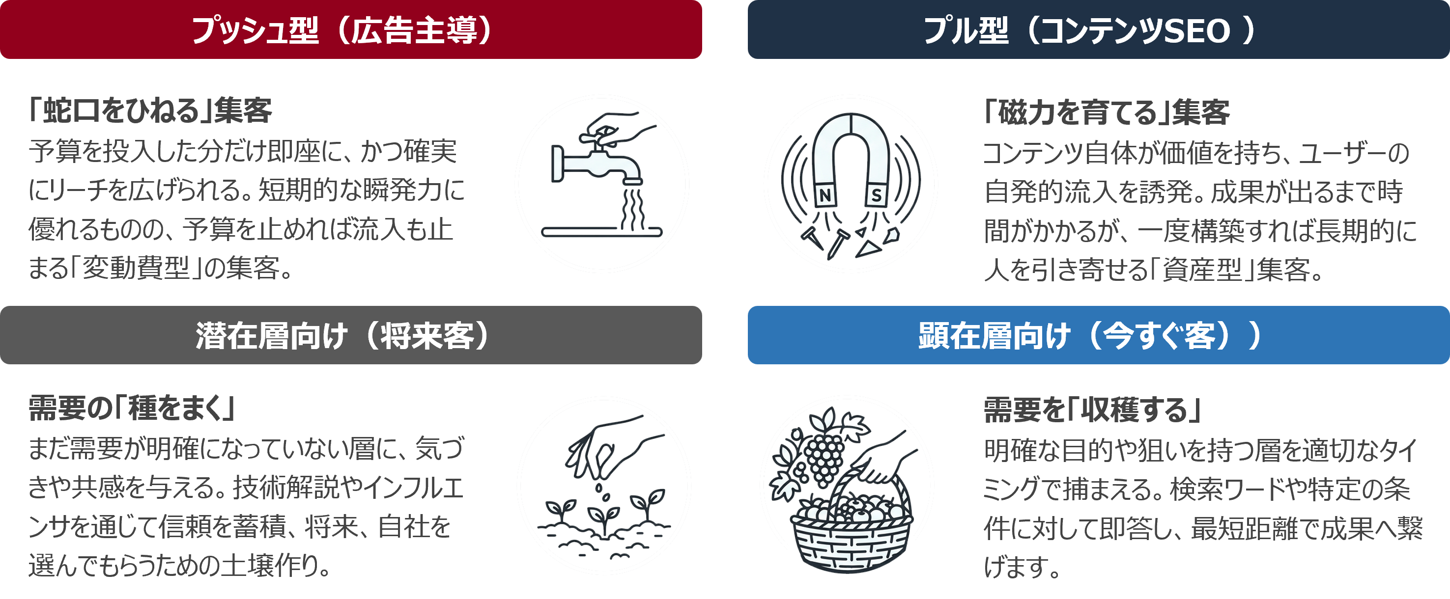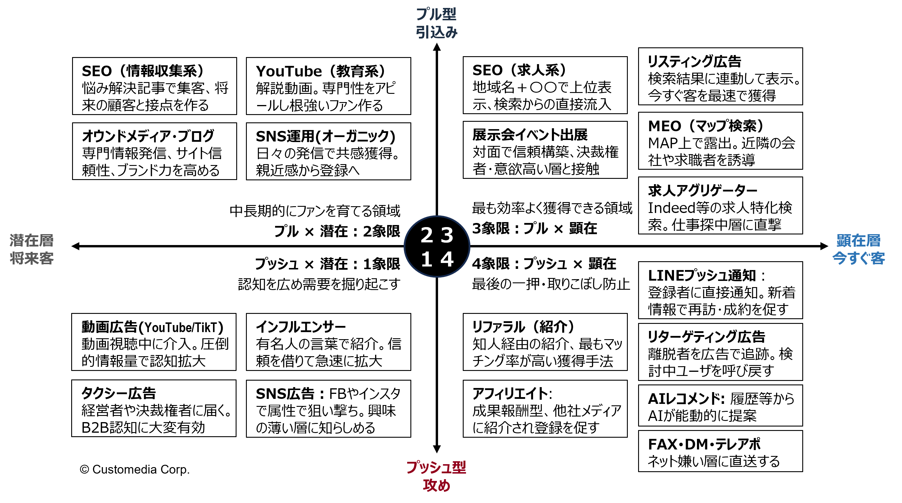 顕在層を掘り起こすか、顕在層を狙い撃ちするか? プッシュ型か、プル型か?