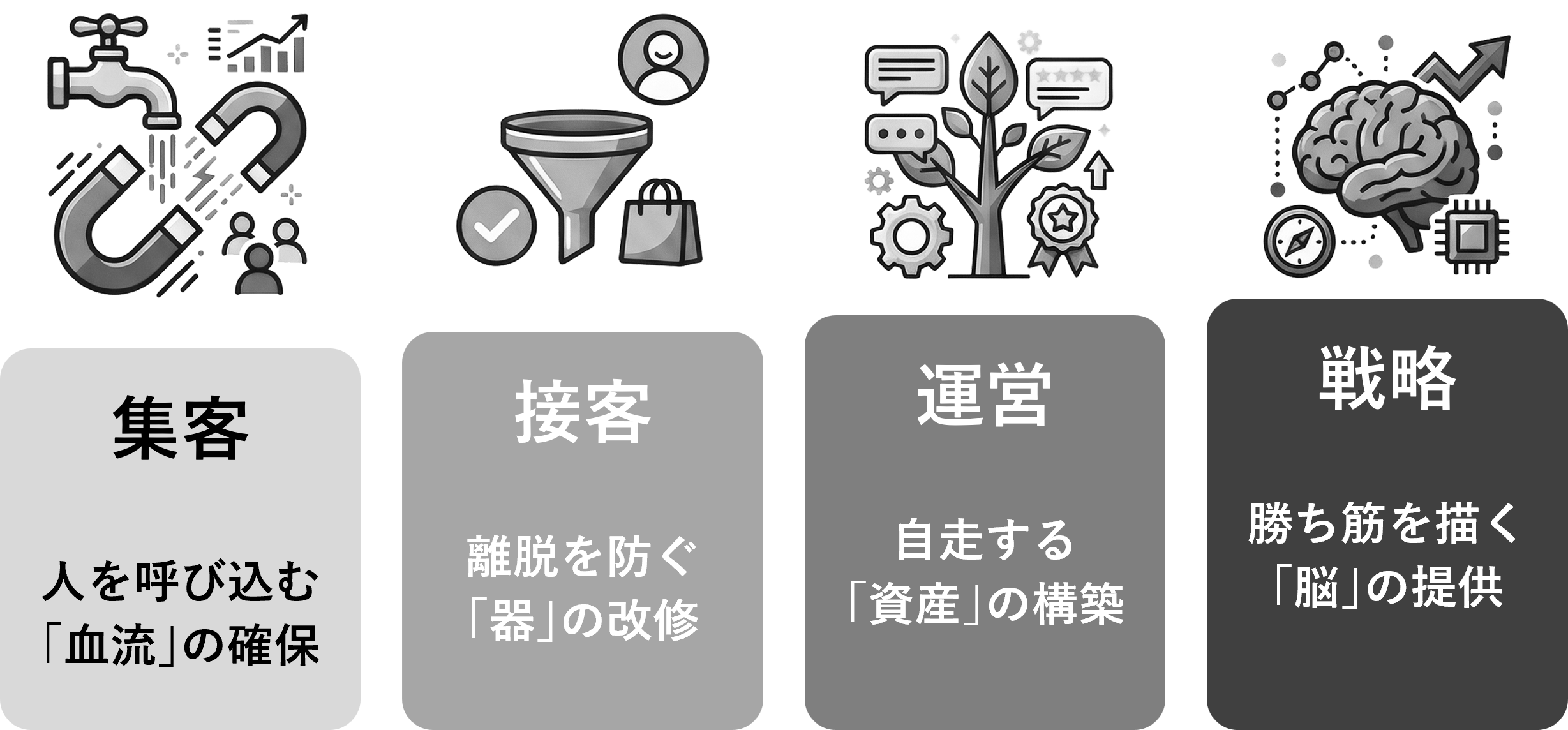 事業は開発して終わりでなく、リリースがスタートライン。そこで開発と並行して事業拡大に向けた伴走支援サービスを提供します。プラットフォーム(器)に集客(血流)を流し、接客(体験)を磨き、資産(筋肉)を蓄え、戦略(脳)を共有することで、事業を成功に導きます。