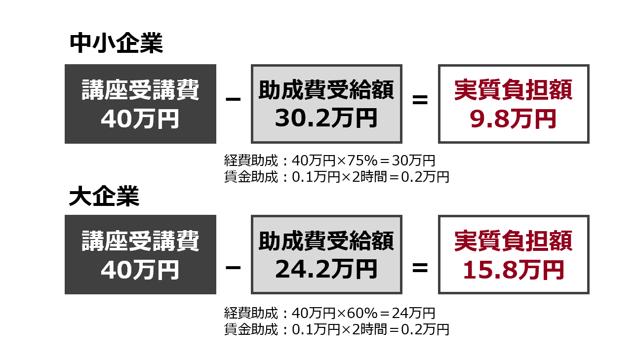 上表は、講座(1人40万円、計10時間、うち2時間が実施研修)を受講した場合の受講者1人あたりの実質負担額を示したものです。