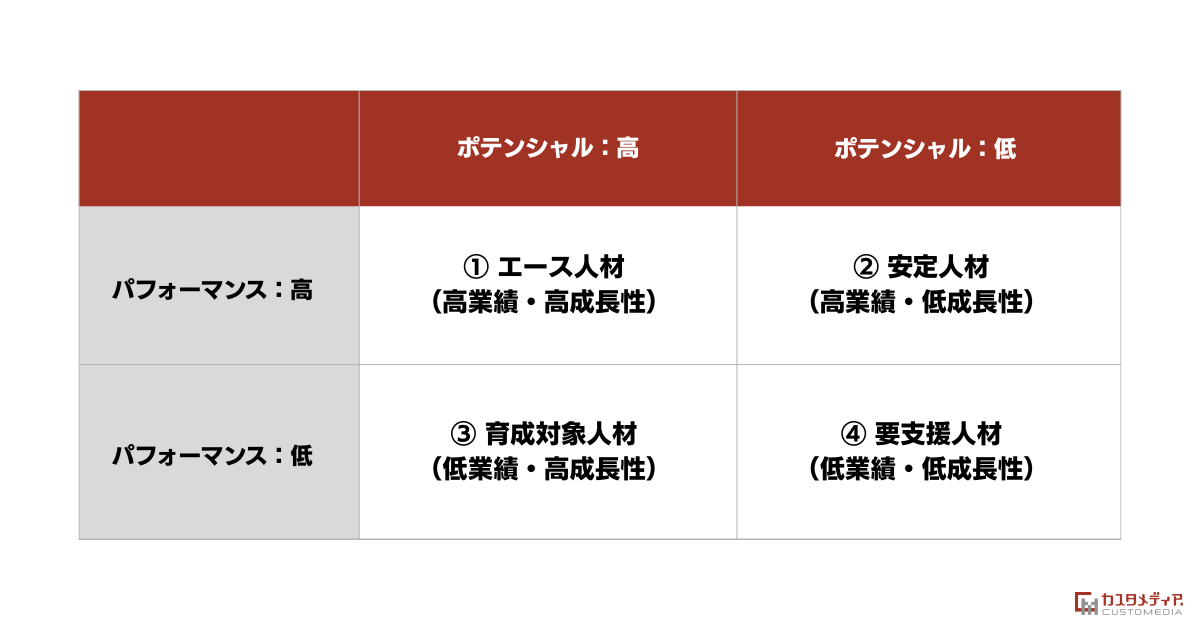 A. 最も一般的な分類は「パフォーマンス(業績)×ポテンシャル(成長性)」の4象限です。