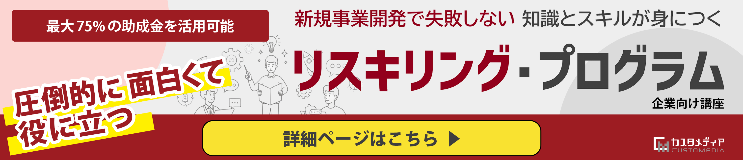 リスキリング研修で最も多い悩みは、「コスト」と「現場への定着」です。カスタメディアの支援サービスでは、公的な助成金を最大限に活用し、財務負担を軽減しながら、経験豊富な講師による「現場で使える一生モノのスキル」の習得を徹底サポートします!