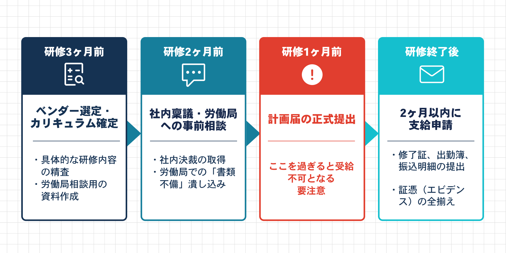 | 2月 (研修2ヶ月前) | 社内調整 | 社内稟議・労働局への事前相談 | 最大75%受給に不可欠な「賃上げ要件(3%〜5%)」をクリアするため、就業規則や賃金規定の改定案を固めます。 |