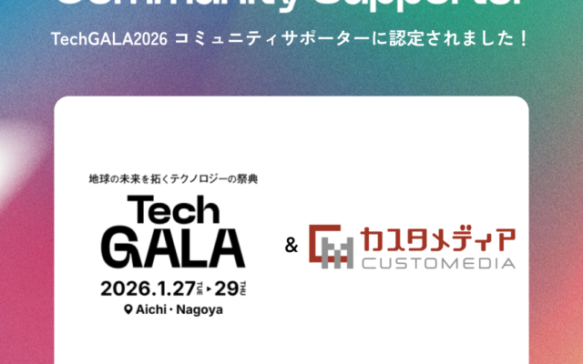 カスタメディアは1月26日(火)〜1月29日(木)に愛知県で開催されるテクノロジーの祭典『TechGALA』のブース出展&コミュニティサポーターに認定されました。また、弊社のコミュニティマネージャーのタンクトップ渡辺さんがイベントに参加いた…